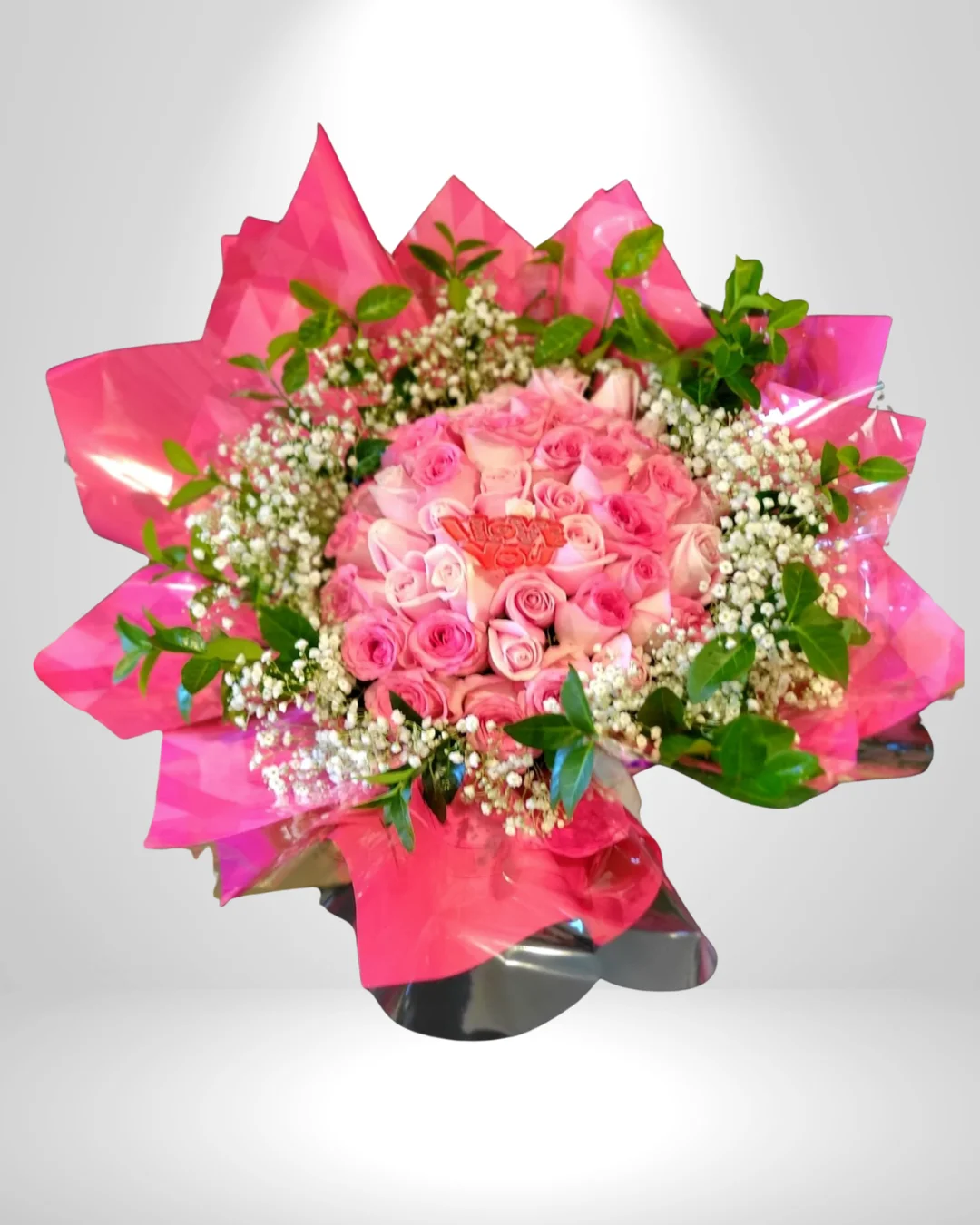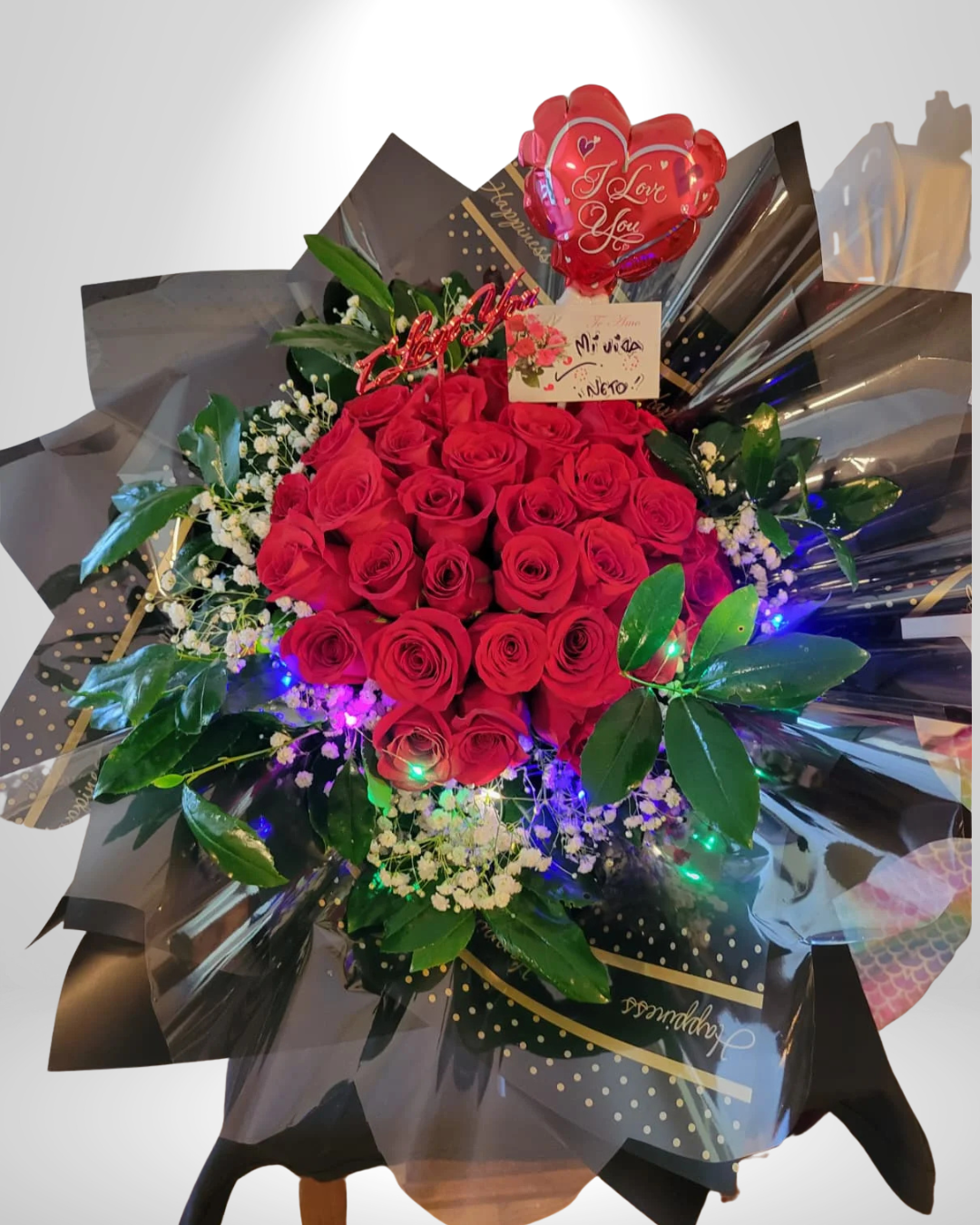 Complementos Especiales: Acompañado de follaje verde brillante, delicada “Gypso” (lluvia de novia), un globo de corazón “I Love You” y una tarjeta para tu mensaje personalizado.