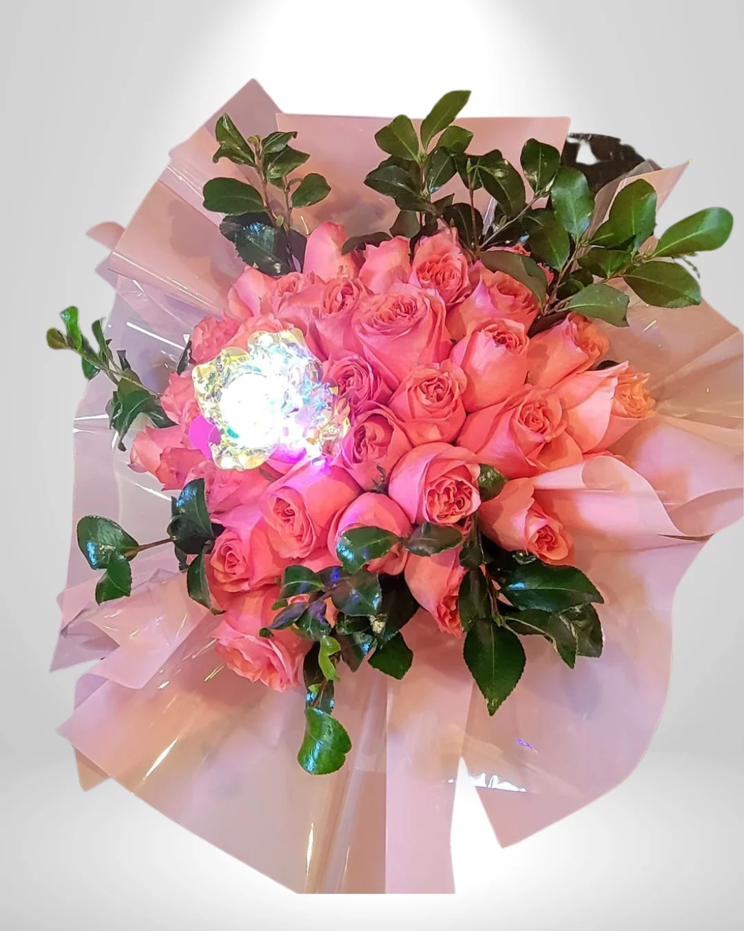 Toque de Brillo: Incorpora una serie de luces LED micro que iluminan las flores desde el interior, ideal para entregas nocturnas o cenas románticas.